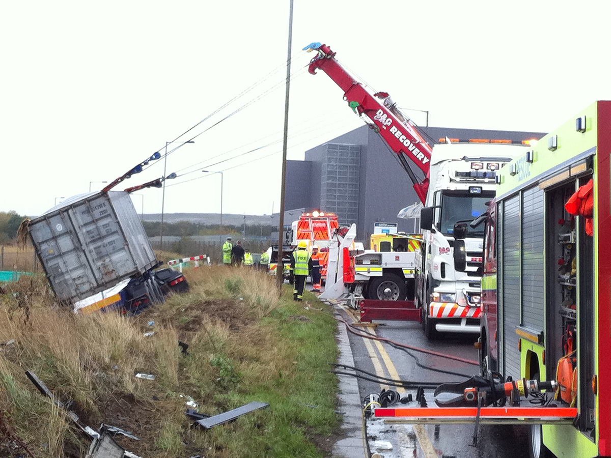 Heavy vehicle accidents require methodical recovery preserving evidence and minimising scene disruption. Our operators work with police, fire services, and highways authorities establishing safe working areas and developing recovery strategies. We preserve accident scenes for investigation, document vehicle positions, and recover vehicles maintaining evidential integrity. Load recovery coordinates cargo transfer to alternative vehicles or proper disposal of damaged goods, following appropriate protocols for hazardous materials. Environmental protection manages fuel spills and contamination properly. Traffic management coordinates with Highways England and police for lane closures and contraflow systems.